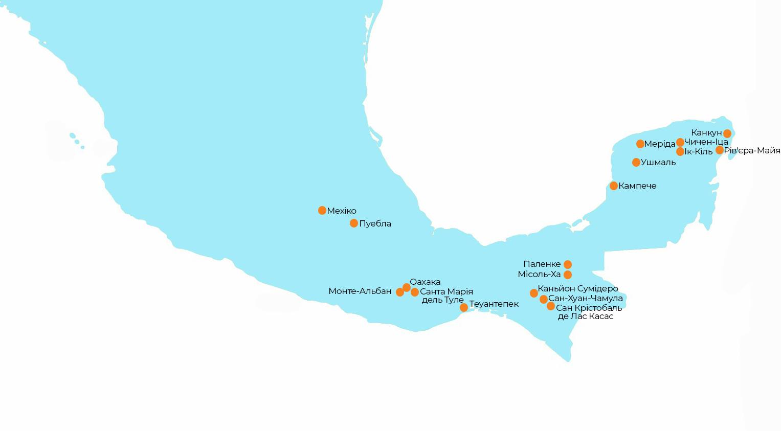 Мехіко - Пуебла - Оахака - Монте-Альбан - Санта-Марія-дель-Туле - Теуантепек - штат Чіапас (Каньйон-де-Сумідеро - Сан Крістобаль де Лас Касас) - Сан-Хуан-Чамула - водоспади Місоль-Ха - археологічна зона Паленке - Мексиканська затока - Кампече - археологічна зона Ушмаль - Меріда - Чичен-Іца - озеро Ік-Кіль - Канкун - Рів'єра-Майя - Канкун